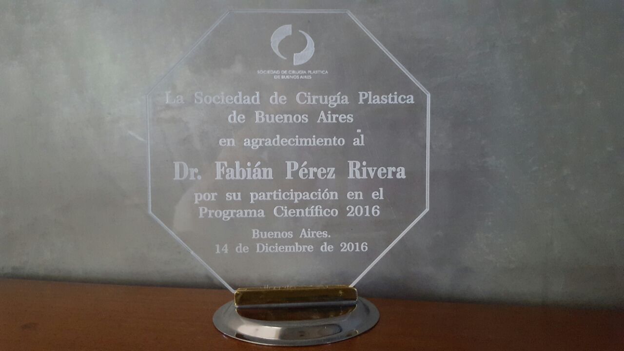 Distinción recibida por el Dr. Pérez Rivera por coordinar y moderar las dos primeras sesiones online de "Complicaciones en Cirugía Estética" de la SCPBA. Durante la cena de camaradería de la Sociedad de Cirugía Plástica de Buenos Aires.